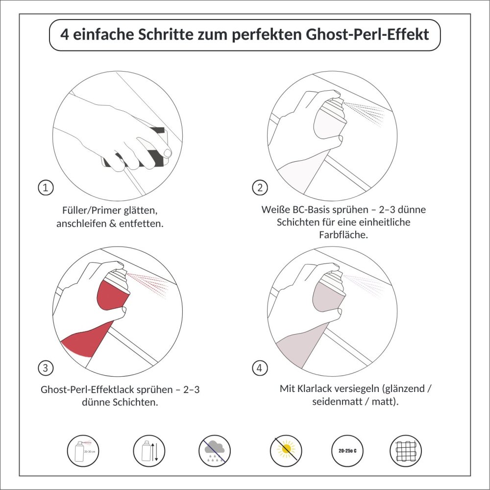 Ghost Pearl ist ein Drei-Schicht-Lack, der einen weißen Basislack, anschließend die Ghost-Perl-Effektfarbe und zum Schluss einen klaren Decklack für verstärkten Perlglanz, Tiefenwirkung und UV-Schutz erfordert.